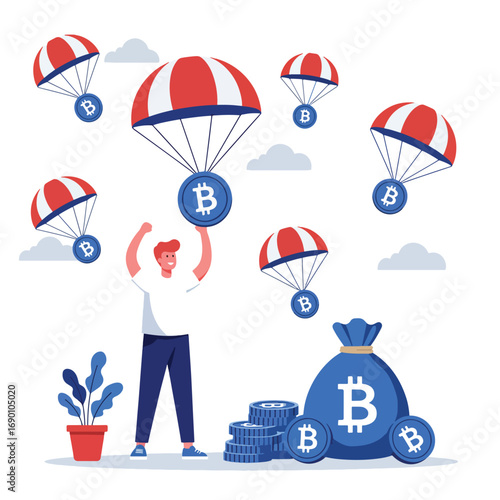 Mining tools breaking rocks with embedded Bitcoin coins, person pointing in direction. Ideal for finance, cryptocurrency, blockchain, digital investments, economy, data mining fintech. Simple flat