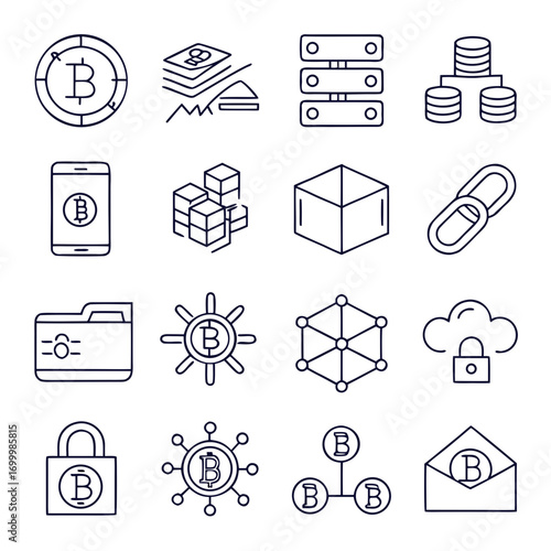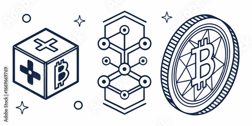Blockchain and cryptocurrency line icons featuring cubes, nodes, and bitcoin symbols