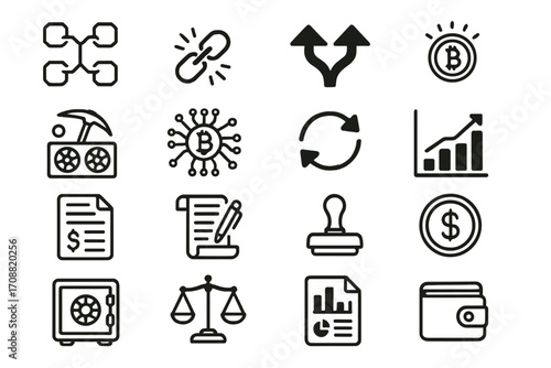 Such as Blockchain icons. Prediction, Code, Secure, Exchange, Anonymous, Conversion, Analysis, Access, Distributed, Ico, Revenue, Consensus, Cryptocurrency vector illustration.