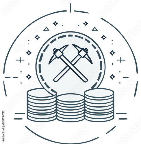 Pickaxes striking cryptocurrency coins in a rock, Bitcoin symbol, growth chart. Ideal for blockchain, finances, digital currency, investment, mining technology progress themes. Simple flat metaphor