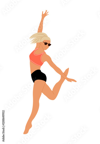 Stylish blonde fashion woman illustration wearing sunglasses, kneeling pose, modern pop art vector character, confident attitude, vibrant colors, isolated white background