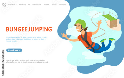 Bungee jumping. Bungy jump off bridge cliff on cord, brave jumper young man fall down with elastic rope free falling flying fun adrenaline fearless, classy vector illustration