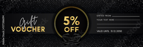 5 percent off gift voucher template design with gold circle frame and dotted line black background. Premium design for discount label, coupon sales, special offer, discount coupon, coupon code.