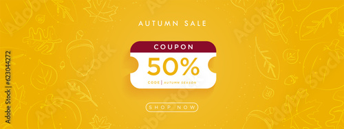 Autumn Sale Online Voucher Banner Concept on orange gradient background with drawn leaves, maple, pumpkin, acorns. Pop up coupon with space for code and 50% off, shop now button. Vector Illustration.
