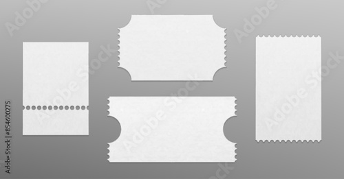 Blank tickets set isolated on background. Vector realistic illustration of white coupon mockup with empty space for text, admission card for concert, theater event, shopping discount of sale offer