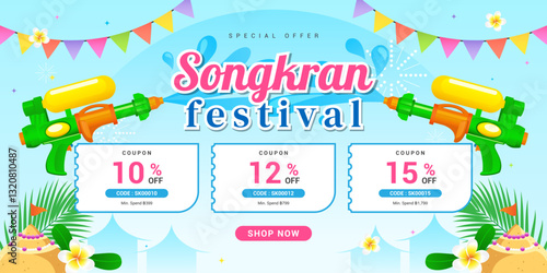 Songkran festival coupon promotion banner vector illustration. Thai New Year Holidays celebration