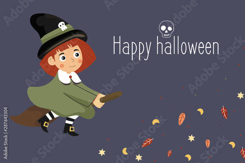 A fun cartoon Halloween witch with a hat flying on a broomstick, a magical character illustration