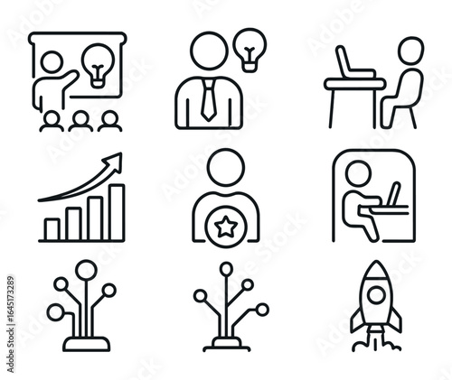 Tech Startup Icons. A team working on an app development project in a tech startup. Line outline icon set of A