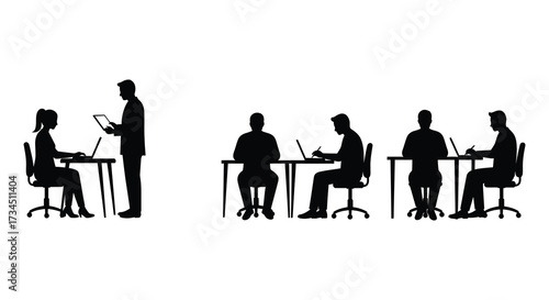 Business Meeting Silhouette — Three People Collaborating at a Table with Computer, Minimalist Black and White Design