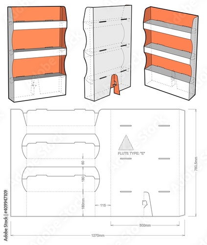 Counter display stand and Die-cut Pattern. The .eps file is full scale and fully functional. Prepared for real cardboard production. The .eps file is full scale and fully functional.