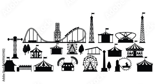 Amusement park silhouette vector, carnival icons, ferris wheel, roller coaster, carousel, tent, amusement ride collection, theme park outline design, entertainment graphics, adventure logo assets