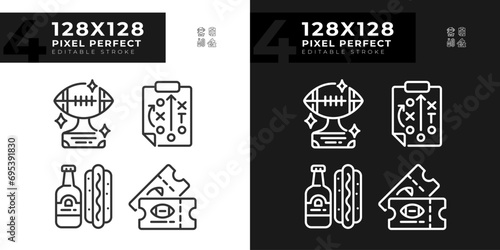Football celebration linear icons set for dark, light mode. Trophy for champions. Football match tickets. Playbook. Thin line symbols for night, day theme. Isolated illustrations. Editable stroke