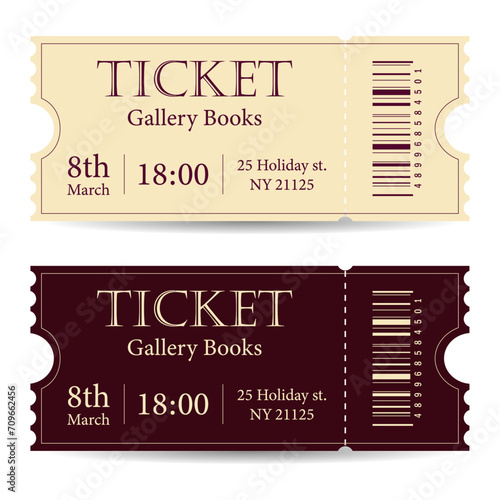 Set of Blank tickets or coupons with barcode, vector templates with copy space isolated on white background. event, airplane, train, circus, sport, football invitation illustration