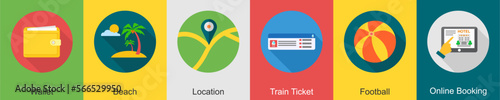 A set of 6 travel icons as wallet, beach, location, train ticket