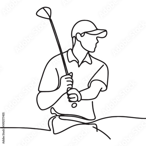 Continuous one line drawing male golfer finishing his powerful swing with elegant follow through, depicting athletic motion, grace, and satisfaction of hitting perfect shot. Design vector illustration