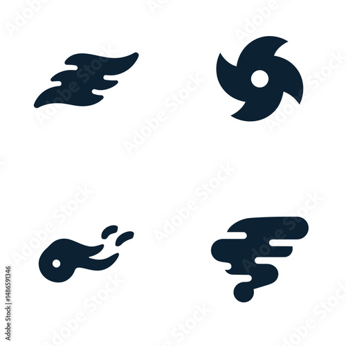 Wind Motion Icons. Solid style icons of a gentle wind sparking action: curved breeze lines, spark icon, motion arrow, flow swirl,