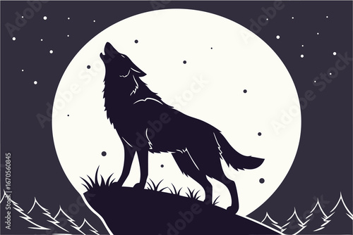 Dramatic howling wolf silhouette under moonlit sky with evergreen trees for nature designs