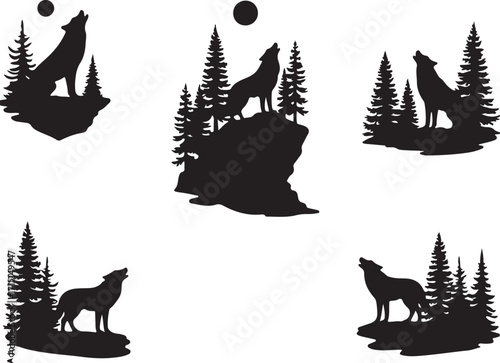 Wolf silhouette set, howling and standing poses, black vector illustration, forest animal icons, wild creature design, nature theme, minimal graphic style