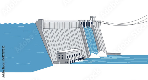 Hydroelectric dam illustration with mountain backdrop in a minimalist line art style