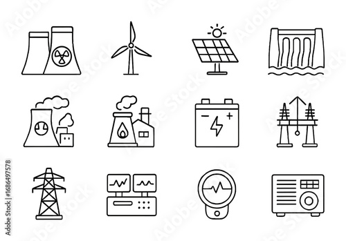Clean Linear Icon Collection Representing Modern Power Plants and Electricity Generation