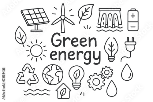 Renewable Energy Doodle Icons. Hand-drawn doodle illustration [renewable energy systems] [solar panel, windmill, hydro turbine, battery, sun, water droplet,