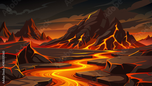 Dramatic volcanic eruption at night with flowing lava and fiery skies