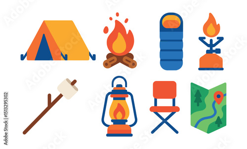 Camping adventure vector set with tents, backpack, campfire, map, sleeping bags, lantern, hiking gear, marshmallows and outdoor travel equipment