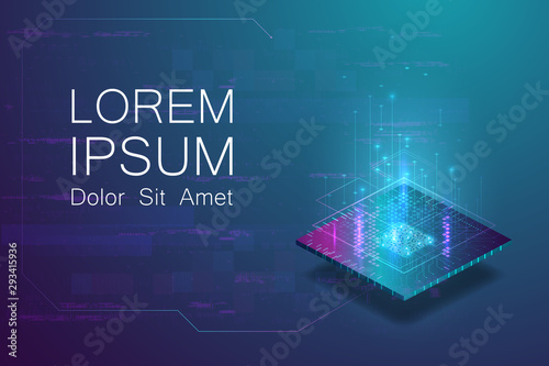 Isometric view of a glowing blue microchip with circuit patterns on a dark blue background design element