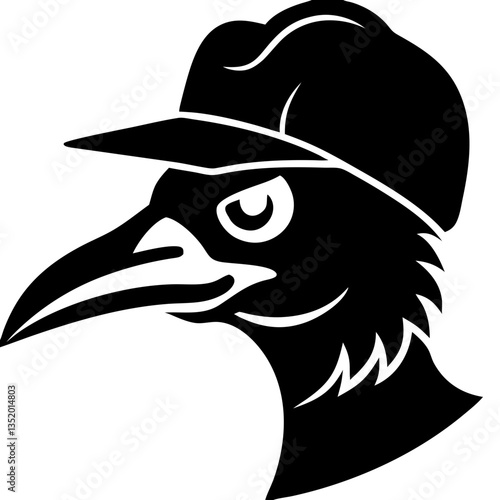 Vector illustration of a raven in dark graphic style. Black and white bird with detailed feathers, mystical and gothic aesthetic, isolated on white background.