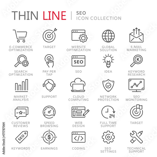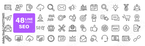 Set of editable line icons of SEO - Search Engine Optimization. Thin line web icon collection. Simple vector illustration of development, optimization, analysis, and analytic.