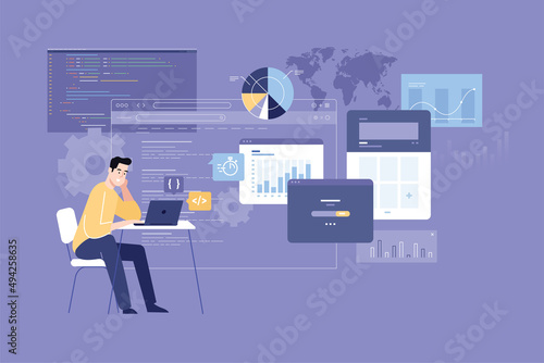 Seo analysis modern flat concept for web banner design. Man analytic analyzes site data and studies graphs on screens and develops promotion strategy. Vector illustration with isolated people scene