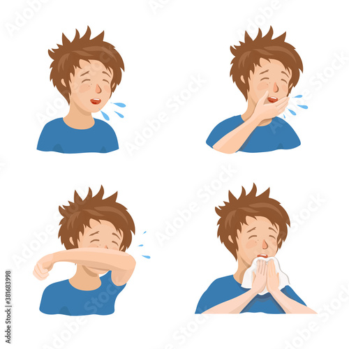 Man coughing and sneezing set showing respiratory hygiene and elbow sneeze etiquetteMan coughing and sneezing set showing respiratory hygiene and elbow sneeze etiquette