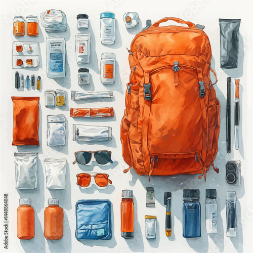 Isometric outdoor adventure gear with backpacks, climbing tools, and survival kit