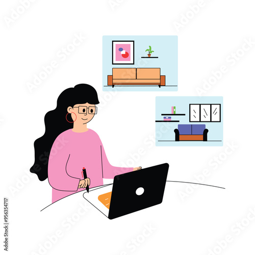 Interior designer woman. Young girl sits at computer near apartment blueprint. Businesswoman chooses furniture for room. Comfort and coziness. Flat vector illustration