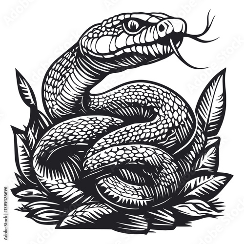 Striking cobra rises majestically from stylized grass, presenting its forked tongue in a monochrome design