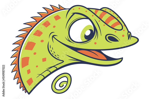 Cartoon chameleon sticks out its tongue. Fun animal, wild creature, reptile character, illustration, crazy, colorful, lizard, wildlife, nature, comic.