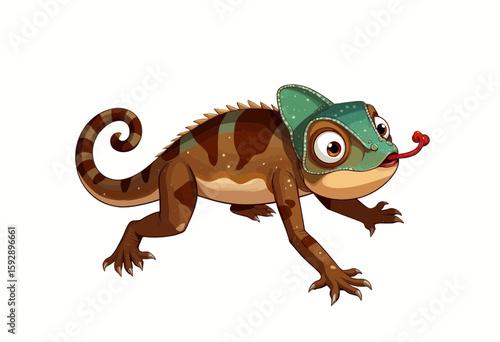Playful cartoon chameleon smiles and reaches out its tongue, isolated on a white background