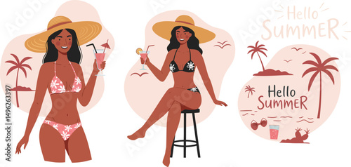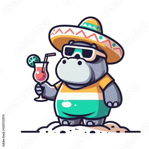 Man at the beach holding cocktail drink, summer vacation illustration design