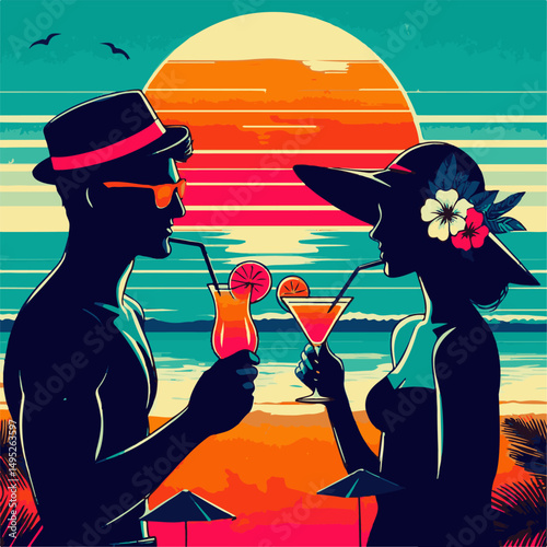 Illustration of a man enjoying a tropical drink near surfboards with seaside scenery