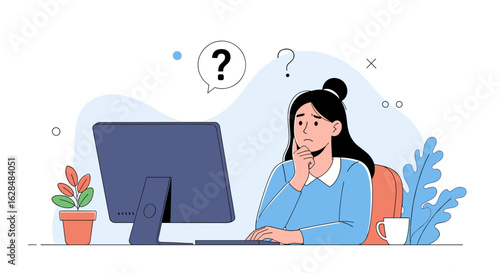A young woman sitting with her chin in her hands and question marks above her head.