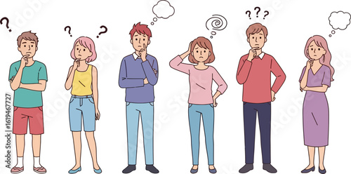 Diverse group of people pondering questions, showing confusion and contemplation in a clear, modern illustration style.