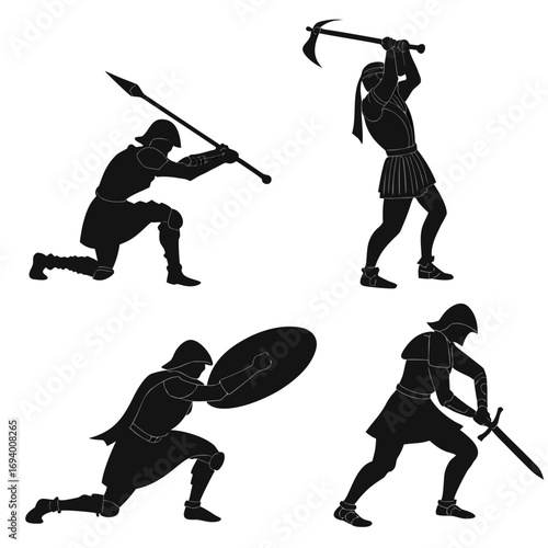 Black knight silhouettes sword shield armor poses white