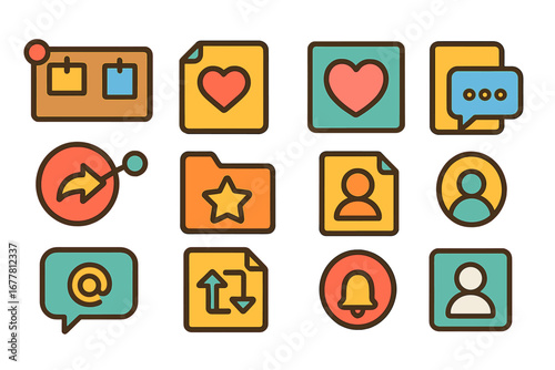 Hand-drawn social media icons set with heart, chat, and notification symbols