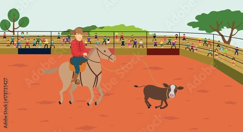 Cowboy caught cow with lasso from rope on his farm, animals on wild west ranch, design, cartoon style vector illustration. Farming in texas, man near livestock, mountain nature and green trees outdoor