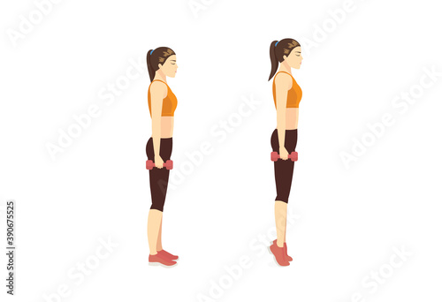 Woman doing standing calf raises with barbell exercise. Flat vector illustration isolated on white background