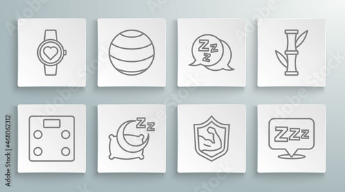 Set line Smart watch, Fitness ball, Big bed, Dumbbell, Essential oil bottle, Bodybuilder muscle, Avocado fruit and Smartwatch icon. Vector