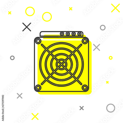 Black ASIC Miner icon isolated on white background. Cryptocurrency mining equipment and hardware. Application specific integrated circuit. Yellow speech bubble symbol. Vector Illustration