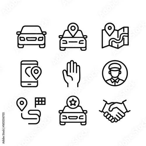 Ride sharing and taxi icon set. Car rental service and sharing. Pixel perfect, minimalistic web and UI icon. Outline icon collections. Editable vector illustration.