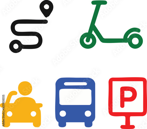 Urban mobility icons: scooter, bicycle, rideshare, public transport, navigation