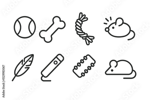 Pet Toy Icons. Line style icons for pet toys: ball, bone, rope, squeaky toy, feather, laser pointer, chew toy, mouse toy. No text,